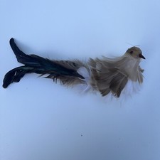 Add some vintage charm to your Christmas decor with this beautiful handmade feathered bird ornament. The bird features a brown color with a long tail and plastic feet/beak. It's perfect for any occasion, not just Christmas, and makes a great decoration for bird lovers or anyone who appreciates unique ornaments. The bird is made from real feathers and has plastic eyes, giving it a realistic look. It's a one-of-a-kind piece that will add character to your collection. Don't miss out on this original and collectible bird ornament.