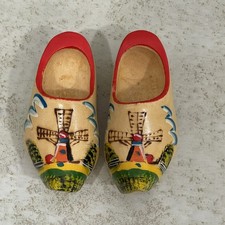 Vintage Hand Painted Traditional Dutch Wooden Mini Clogs Shoes Souvenir 4.25”L Pre Owned Like New Condition - Traditional Dutch souvenir / decorative collectible wooden clogs featuring hand-painted windmill designs with landscape details & red accent edges - Made of hand carved wood - Measures 1.5” H x 2” W x 4.25” L *** Never used, kept for years. Clean, no cracks. Original sticker still attached. Shows tiny paint chips on the red edges, production imperfection. See pictures. Smoke & Pet Free Home #157/b10/GSO26/cp