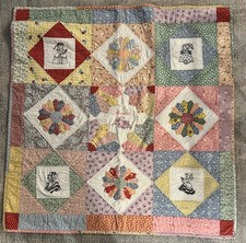 15T500110825874927 This Vintage Handmade Baby Quilt measures 38.5”x38.5” and is adorned with a multicolor design. Made with care and attention to detail, this quilt is a unique and charming addition to any nursery bedding collection. The handmade aspect adds a special touch to this adorable baby quilt, making it a timeless piece for your little one's room. It does have the name “Mercedes” on it that could be removed. It’s a super cute vintage find and in great condition!