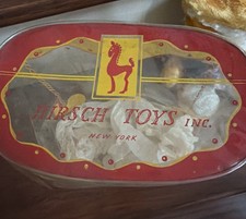 This Vintage Hirsch Toys Inc Stuffed Easter Bunny is in excellent vintage condition and looks like it was never used for play. The colors are vibrant, there are no signs of wear and the original packaging is included. Tin button eyes, a metal button nose, a satin ribbon and felt tongue and collar are all marks of a high quality made toy. The bunny measures 12” in length.
