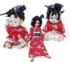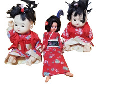 These dolls bring a touch of tradition and artistry to any space. A unique find for doll enthusiasts or fans of Japanese culture. One standing doll with floral kimono, black obi, and red hair accessory.