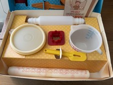 The mat in the “Mix It” set has aged and hard. The Vintage Kids Tupperware Tippertoys Party Set & Mix it is a nostalgic kitchen set designed by Tupperware specifically for young children. This set includes various tools and utensils for cooking and playing, appealing to kids aged 1-11 years who love imaginative play and creating messes in the kitchen. The vintage design adds a unique touch to this interactive and educational toy, making it a cherished addition to any child's playtime.