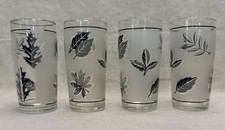 🥤 Classic 1960s Libbey juice glasses featuring a frosted background with elegant silver leaf graphics. • Type: Juice glasses. • Design: Frosted glass with silver leaf pattern. • Era: 1960s. • Quantity: Set of 4.