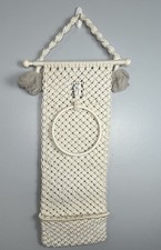This Vintage Macrame Wall Hanging Towel Holder and Pocket with a cute bear design in white is a charming piece of 1970s decor. Handmade with care, this unique wall art adds a touch of retro style to any space. The macrame detailing and vintage design make it a stand-out collectible for those who appreciate mid-century aesthetics. Perfect for adding character and functionality to a room, this wall hanging towel holder is a must-have for collectors of vintage home decor. The bottoms is a pocket and the center is a towel holder. Has cute vintage bear at top. Does show wear and some minor discolorations. See photos for condition and measurements.