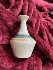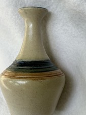 This Vintage Mid-Century Modern Genie Pottery Vase is a unique and signed piece, showcasing a beautiful beige, tan, and blue color palette. Made of stoneware, this original art pottery vase stands at 4 1/2" tall with a semi-glossy finish. Its production style and technique reflect the artistry of the mid-century modern era, making it a standout decorative piece for any vintage lover's collection. Signed on the bottom as shown in photos. Perfect condition