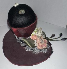 4” T. Mix of fabrics-velvet, satin, lace, embellished with faux pearls and beads, crochet and satin flowers and silver trim.