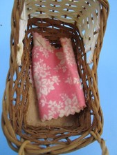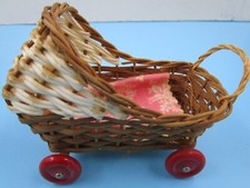 Stroller is woven rattan with white woven plastic hood and red plastic wheel mounted on wood base. Stroller is labeled.
