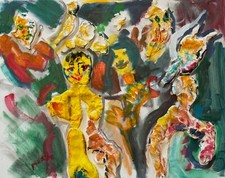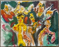 It's rather interesting, in our opinion. Colors: Multi-color. The artwork is signed towards the lower left-hand side of the canvas in red (see photos). CONDITION : Good condition. The artwork is being sold "as-is" and "as-described".
