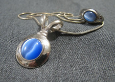 Vintage moonglow blue plastic cab silvertone pendant chain necklace + ring