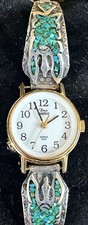 The mark inside the tips is from Prince Trading Company, Kirkland, New Mexico. The watch tips were made in the 1970s or 80s. I’ve got a 3” stretchable extender on the watch but you can easily replace it with another size if need be. Beautiful blue green turquoise inlay. The Timex indiglo watch with black bezel works as it should. Ready to wear.