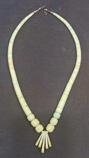 28" green turquoise heishi bead necklace with five piece pendant and sterling silver findings. The pendant is 1 3/4" long x 1 1/2" wide and the beads are graduated from 11/16-3/16".
