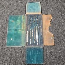 Housed in its original fold-out case with blue-green felt lining, this set includes a wide array of classic tools—compasses, dividers, ruling pens, and extension arms —used before the digital age. Model: No. 114.