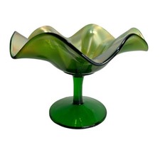 Vintage Northwood Carnival Glass Ruffled Pedestal Compote Candy Dish Green Gold