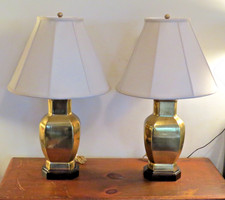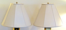 Brass Hollywood regency style with original shades and finials. There are a couple of very small spots on the shades, one shade has a small very light water stain at the bottom that can only be seen on the inside, does not show through when the lamp is on.