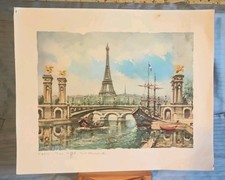 Vintage Paris Tour Eiffel Pont Alexandre III Print Signed M. Legendre 19.5"x16"