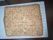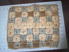Vintage patchwork quilt square / table topper featuring a charming checkerboard design made from blue gingham, tan plaid, and cream floral fabrics. The piece has a soft padded texture with visible quilting ties throughout, giving it a classic country farmhouse aesthetic. The fabrics appear to be a mix of traditional prints commonly used in primitive and country-style quilting, and the edges are softly bound with a coordinating fabric border. Vintage condition with wear from age. There is a noticeable opening in the backing seam where the batting is visible (see photos). This could be repaired with simple stitching and is common with older small quilt pieces. Because of this, the item is being sold as vintage textile / repair project.
