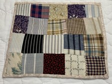The design is four patch - squares - 2 1/4” by 2 1/4”. The fabrics are solids, stripes, checks, and early floral calico prints. The colors are white, blue, navy blue, red, light blue, brown, gold, mustard, black, purple, multi.