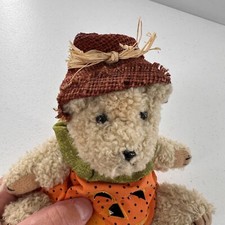 Vintage Plush Teddy Bear In Pumpkin Costume Hat & Green Collar Halloween Retro