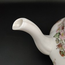 Made in England in 1985, this round tea pot features a floral pattern, hand-painted detailing, and a glossy finish. The set includes a lid and is part of the original Brambly Hedge collection by Royal Doulton.