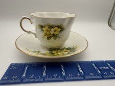 This vintage Royal Minster tea cup and saucer set features a charming design with yellow flowers and green leaves, adding a touch of elegance to your tea-drinking experience. The white, yellow, and green color palette gives the set a timeless and classic look, perfect for collectors or those who appreciate vintage kitchenware. Enjoy your tea in style with this original and vintage set that is sure to add a touch of sophistication to your tea time. Sold as is- no box. Sticker residue on bottom. Any questions please ask. No returns. Please review pictures.