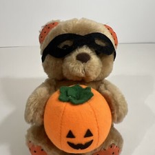 The vintage Russ Berrie Luv Pets Halloween PUMPKIN Masked 5" Teddy Bear is a small stuffed animal with a Halloween theme. This teddy bear features a pumpkin mask, adding a fun and festive touch to its design. It is suitable for children aged 3 and up, making it a great toy for kids to play with during the Halloween season. The Russ brand is known for producing quality stuffed animals, and this Luv Pets teddy bear is no exception, making it a cute and collectible addition to any toy collection.
