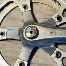 Here is a used Sakae SX triple crankset. 170mm square taper crank arms. No inner chainring. The middle position chainring is a 40 tooth Specialized and the outer ring is 46 tooth and not manufacturer labeled.