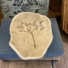 This vintage pottery dish is a unique piece from the late 20th century, handcrafted by Ellyn Studio Art. The Elderberry Imprint pattern features a beautiful green color and is made of ceramic material. The dish is 6 1/4 inches in diameter and has a hand-painted design. The pottery was produced using traditional pottery techniques in the United States and is an original piece from the late 90s. The backstamp is painted and the dish is signed by the artist. This rare find is perfect for collectors of art pottery and those who appreciate unique handmade pieces. Black marker on bottom 6 1/4” long 5” wide at widest part
