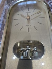 Key Features Materials: The clock features a frame made of faceted 24% lead crystal and cut glass, with a brass-finished gold-tone dial. Movement: It uses a precision quartz movement and was manufactured in Japan. Design: It is characterized by its large arch dial and an oval window at the bottom that showcases a spinning pendulum. Power: The clock typically operates on AA batteries. Dimensions: It stands approximately 9.75 inches tall and 7 inches wide, weighing about 5.5 lbs.