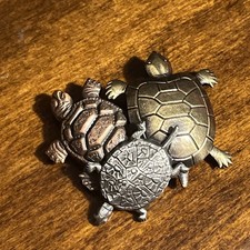 This vintage signed Kiyoka Takahashi (K&T) triple turtle brooch in tri-color metal is a unique and charming piece of jewelry. The round brooch features three turtles in different colors, making it a perfect gift for a birthday occasion. Made of metal in the 1990s, this piece is a signed original from Takahashi, known for its quality craftsmanship. The animal-themed design adds a playful touch, suitable for both men and women who appreciate vintage accessories. (silver, copper, and brass tones)