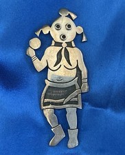 This impressive brooch features a large Mudhead Kachina, and plays important roles in Hopi ceremonies, serving as an entertainer or messenger. This silver pin is in beautiful condition and carries both decorative and spiritual significance. The back of the pin has feather hallmark stamps.