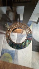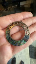Vintage abalone and silver tone pendant stamped KCR on back (Kenneth Cole?). Does not test positive for silver. Missing chain but could easily be made into a necklace again. Feel free to reach out with questions.