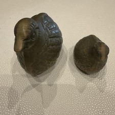 • Paperweights. • Bird / quail collector pieces. Large quail. The larger bird retains its original sticker reading “Genuine Solid Brass – Handcrafted in Korea.”. Small quail. • Origin: Handcrafted in Korea.
