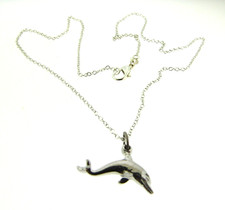 Vintage signed 925 sterling silver solid dolphin pendant in .5x1 inch wide, chain is new in 925 plate with lobster clasp, 18 inches length, very good condition.