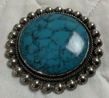 Up for sale is a vintage pin. Sterling silver. Signed. 925. Made in Mexico. The stone is beautiful — Turquoise. More blue than aqua in color. Signed on the back. 925. Sterling. Sterling silver piece has scalloped dot. edges with intricate detailing. Measures 2 1/8” round by diameter. Late 1900’s era. Approx. 20 g. Refer to all pictures. Sold as shown. Will be happy to answer any questions regarding this piece. Thanks and happy shopping. I will combine shipping charges. Smoke free home. Please make payment in three days. ~~~~🌹🌻🌷Please visit my eBay store: 🇺🇸webbsamericancountry1🇺🇸 for over 2000 vintage and collectible items. 🌺🌼🌹