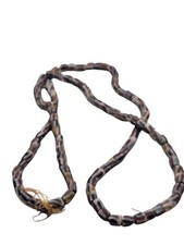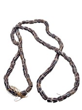 This vintage striped glass trade bead necklace features a 15" strand of handmade beads from African origin. The colorful bands of glass add a unique tribal touch to any outfit, making it a beautiful and collectible piece for those interested in historical and cultural artifacts.