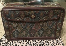 Vintage mid-century tapestry jacquard suitcase featuring a richly woven patterned exterior and maroon leather trim and handle. Classic structured design with original hardware and maker’s logo on the front. Perfect for vintage décor, photography prop, or light travel use. Details: • Era: circa 1960s–1970s • Material: woven tapestry fabric with leather trim • Color: multicolor tapestry with maroon/burgundy leather • Closure: zip closure • Original logo button on front • Clean vintage condition with normal age-appropriate wear Condition: Pre-owned vintage condition. Please review photos for wear consistent with age.