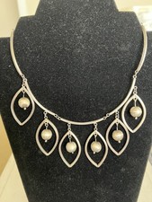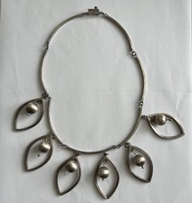 The 16” necklace is comprised of brushed silver dangling bead balls and curved bar sections. Excellent condition with good original closure.