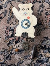 Teddy Snow Crop Black Forest wall clock from 1960’s found in its original shipping package with instructions and brochure. Box has import tag and stamps from Nederland on it. Appears unused. How cool is that? Paint is starting to flake off the eyes… from looking at photos of other ones, this seems to be common. Overall the bear is more cream to beige than white. I assume the paint has discolored some due to age, but I have no idea if it was truly white to begin with. The instructions tell you how to fix the chain if it has become disengaged from the gear in shipping… I followed these directions to take the video to show that it works. It was a simple process. As is. No returns.