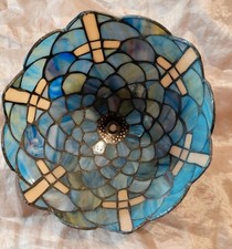 Features multi-colored stain glass with cross accents and scalloped edges.