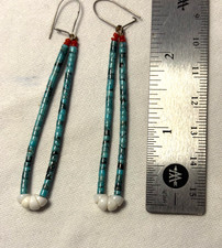 vintage 3 inch turquoise jacla earrings with simple hook earwires. turquoise heishi with nicely carved shell beads and small red beads.
