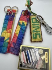 • small sewing notions box with thread cards, safety pins, buttons, and two thimbles. The colorful needlepoint holders are stitched with multicolor yarn on plastic canvas and designed to hold small sewing or crafting tools.
