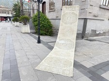 Vintage Turkish Oushak Runner Rug 2.7x12.4 ft Ivory Beige Hallway Wool