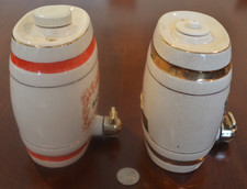 This is a pair of Gilbey Wade Royal Victoria ceramic decanters with tap. One has red decoration and says Scotch, the other has gold decoration and says Cognac. One plastic piece is missing from the Cognac one.