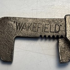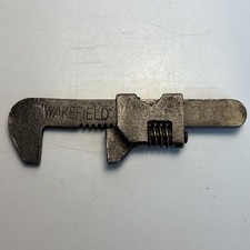 Vintage Wakefield bicycle wrench measuring approximately 5 inches overall length. Marked “WAKEFIELD” on the handle. Features an adjustable jaw with knurled adjustment wheel and integrated hook-style end typical of early bicycle or specialty wrenches. Solid steel construction with aged patina from use and storage. The wrench operates and the adjustment mechanism turns as intended. See photos for details of condition and markings. Condition: Used vintage condition with surface wear, patina, and light corrosion consistent with age. Mechanism moves.