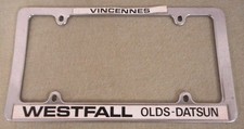Vintage Westfall Olds-Datsun Vincennes, Indiana metal dealer license plate frame. Has scratches, stains, rust, dents, dings and sticker coming loose. Look closely at picture WYSIWYG.
