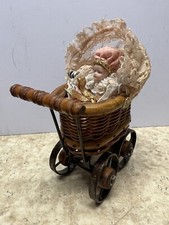 Vintage Wicker Rattan Doll Baby Stroller Carriage Basket With Doll