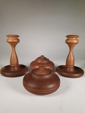 Vintage Wooden Round Trinket Boxes x2 And Pair Candle Holders Have some age and usage related marks One candle holder Have big chip ( last picture) Have some age and usage related marks! Please see pictures for item visual condition and sizes! Thank you! AZ 161