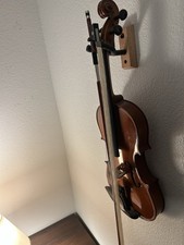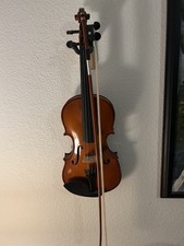 Violin, Case, Bows, and Wall Holder. The violin is unbranded and I don’t know the size. It needs to be tuned and probably needs new strings. The bows also probably need to be replaced as they are broken (the hairs are very rugged) and I doubt they would work to actually play any form of legitimate music. I got this violin years ago and has essentially just sat in my closet. Never learned to play it but hung it as a decoration. Will ship wall holder with order in case you would like to do the same. Will also included calcified rosin.