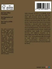 Double check the URL before entering card details online. This card is non-reloadable. No cash or ATM access. Funds do not expire. If you have any issues regarding the item, Feel free to ask. Available for sale within the United States only (not available to Puerto Rico residents).