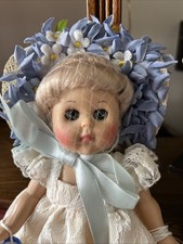 The Vogue Ginny Blue Willow doll from the Teacup Series is a vintage collectible play doll measuring 8 inches in height. Made of hard plastic, this girl doll with blue eyes and light complexion is part of the original production line by Vogue in the 2000s. This single unit doll is Caucasian and perfect for all occasions, making it a unique addition to any doll collection. Never played with still has hair net on and teacup still wrapped in plastic. So adorable and from smoke free home.